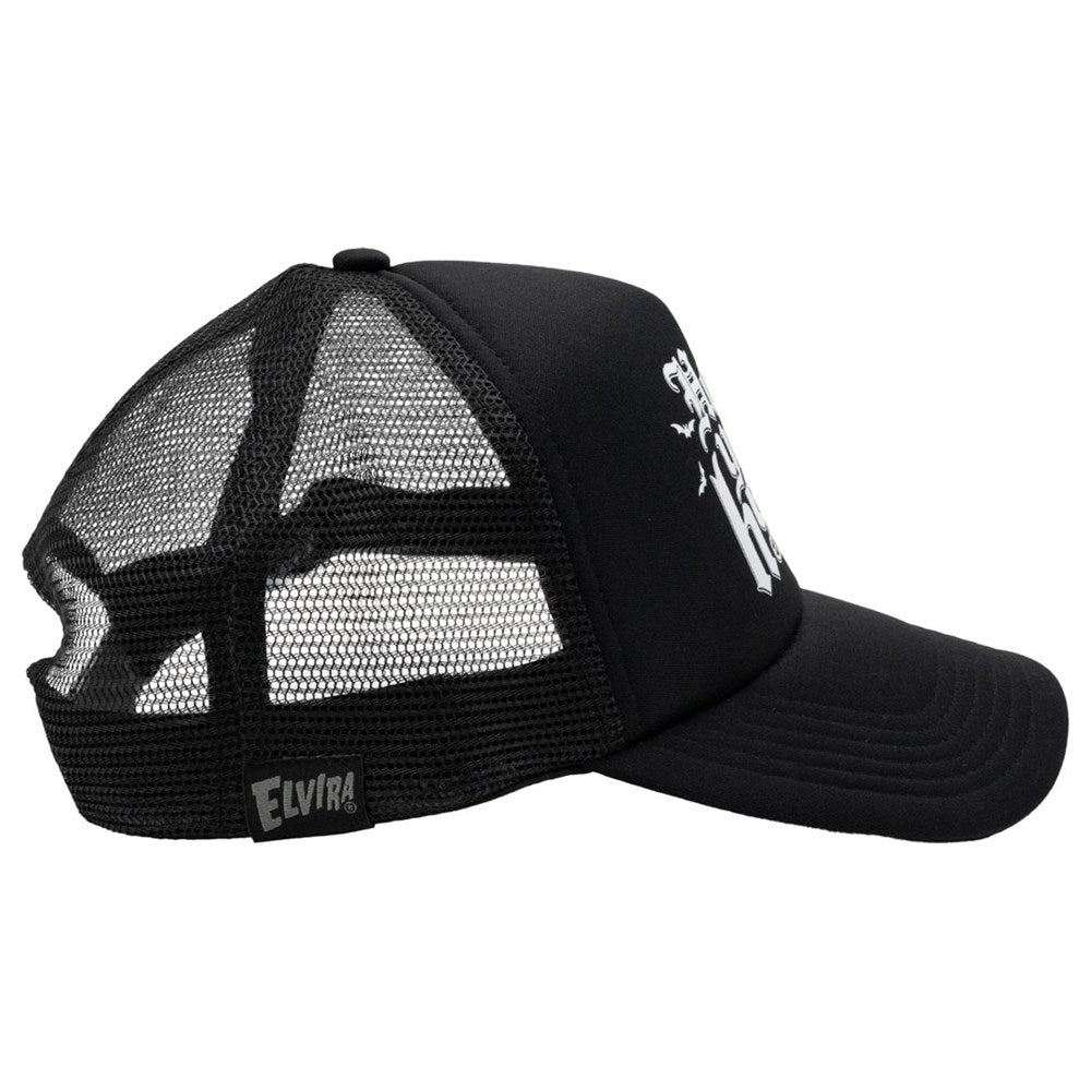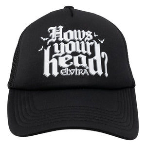 Elvira How's Your Head White Slogan Black Trucker Hat