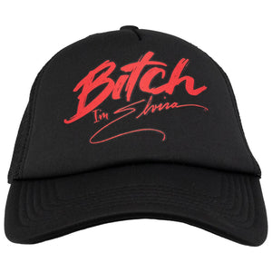 We get freaky if you want, Bitch I'm Elvira! Channel the Mistress of the Dark with this Elvira trucker hat featuring phrase "Bitch I'm Elvira" printed on a 100% polyester foam trucker hat. Includes breathable mesh back and an adjustable plastic snapback for a one-size-fits-most functionality. Hand printed and designed in Los Angeles by the official Elvira's Bootique.