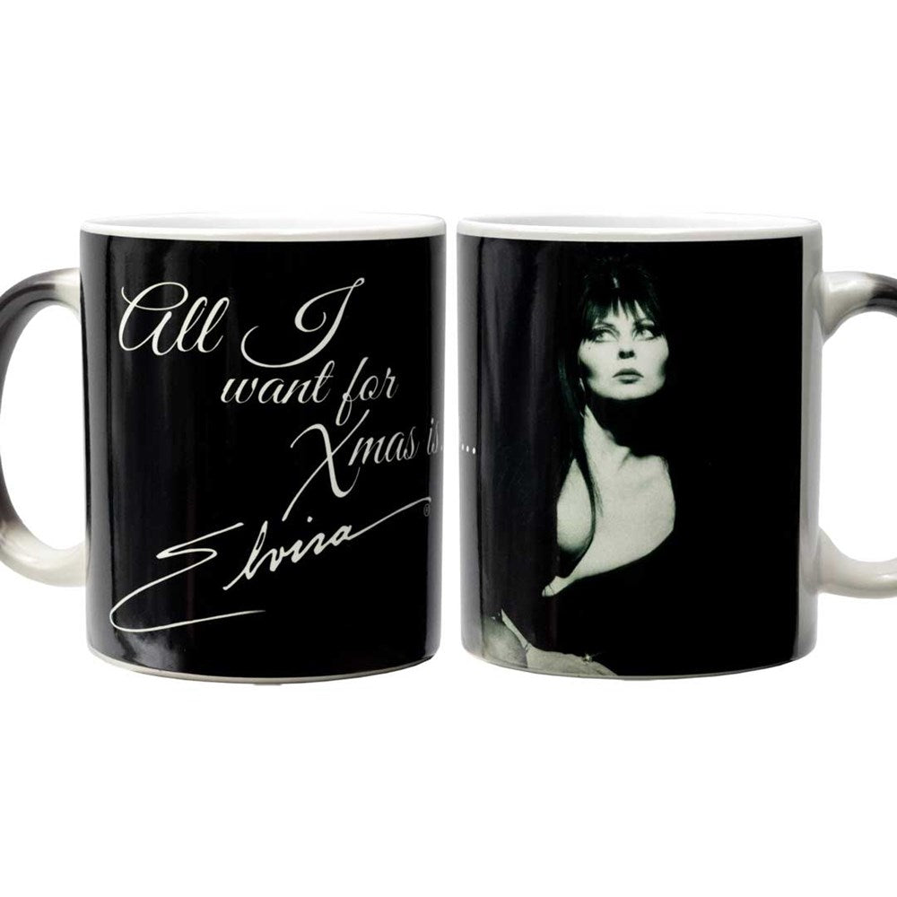 Forget Santa, Elvira's coming to town! The Elvira All I Want for Xmas Is Elvira Color Change Mug is printed on an 11 oz, color-changing ceramic mug. Pour in hot liquid to reveal your secret Xmas wish come true. Hand wash recommended. Hand-printed and designed in Los Angeles by the Official Elvira's Bootique. *Please note this is a seasonal item.
