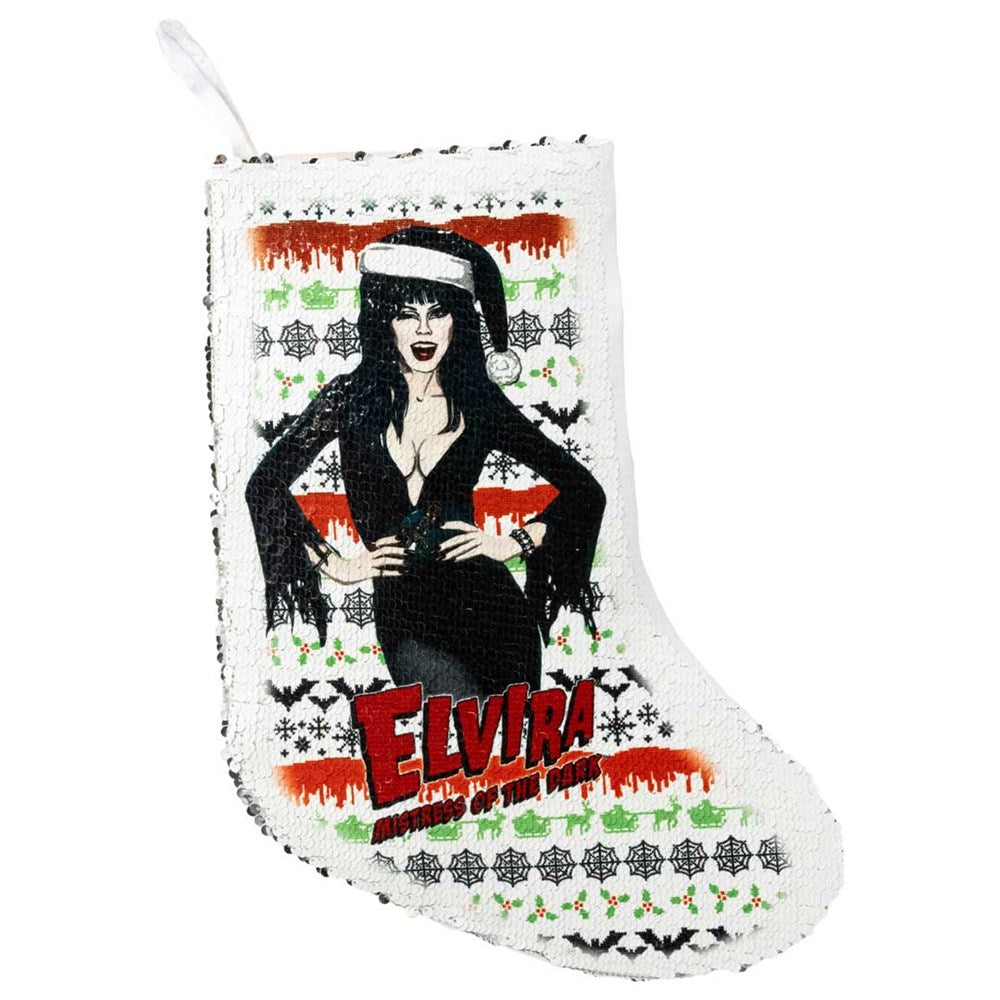 Welcome the ghoul-tide with Santa's flirtatious little helper—Elvira Mistress of the Dark! The perfect place for holiday treats, the Elvira Wink Xmas Sweater Sequin Stocking includes a hanging tag. Front of stocking features silver sequins: when flipped reveal the Elvira design. Satin back with Elvira detail. Size approximately 10 inches (25 cm) x 14 inches (35 cm) NOTE: Due to the hand-printing process of this item, variations in printing are part of the uniqueness of the design and not flaws in the design. Hand-printed and designed in Los Angeles by the Official Elvira's Bootique. *Please note this is a seasonal item.