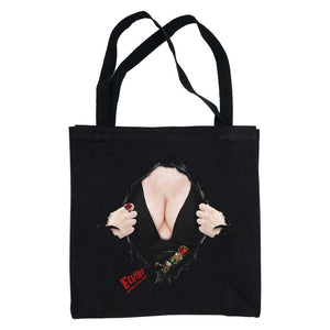 Take your style to otherworldly heights with the Elvira Chest Burst black canvas tote bag. Featuring Elvira's sultry chest busting through printed on a heavy canvas tote bag for a perfect hold all for all your daily accessories or a handy go to bag for any event. Size approx. 14.75" (37.4cm) W x 14.75" (37.4cm) H x 5" (13cm)D. Hand printed and designed in Los Angeles exclusively for Elvira's Official Bootique. *Please note this is a seasonal item.