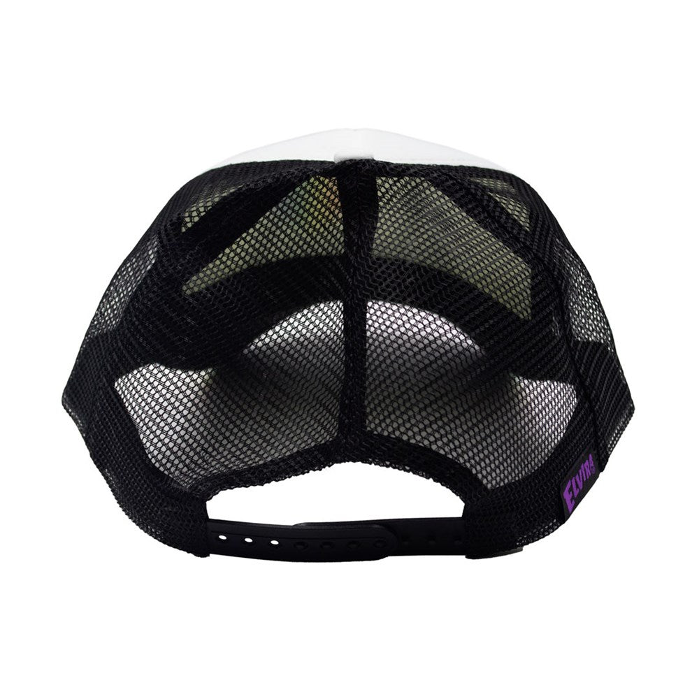 PRIDE 2022 Exclusive! Elvira I Heart Dagger Rainbow Trucker Hat feautring an a rainbow hat and iconic dagger. 100% Polyester. One size fits most. Printed in the USA.