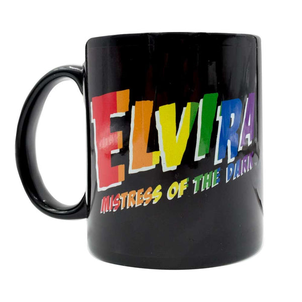 Pride Exclusive! Elvira I Heart Rainbow Mug. 11 oz. ceramic black mug with Elvira I heart rainbow print. Hand wash recommended. Printed in the USA.