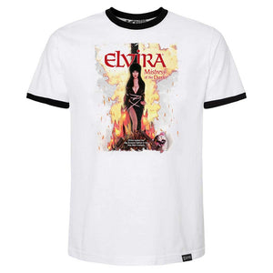 Show off your love for your favorite campy classic with Elvira MOTD VHS Cover Ringer Tshirt. Featuring the iconic cover art from Elvira: Mistress of the Dark printed on a unisex premium soft style feel 100% ring spun cotton t-shirt. With contrast striking black sleeves and neckline, this super soft shirt is the perfect combination of comfort and fashion. Hand printed and designed in Los Angeles for Elvira's Official Bootique.